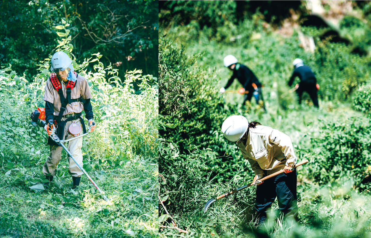 苗木を生育を妨げないよう草を刈る「下刈り」も林業における大事な仕事の一つ。炎天下の中、受講生らは流れる汗を拭いながら、安全かつ効率的な刈払機の使い方を学んだ
