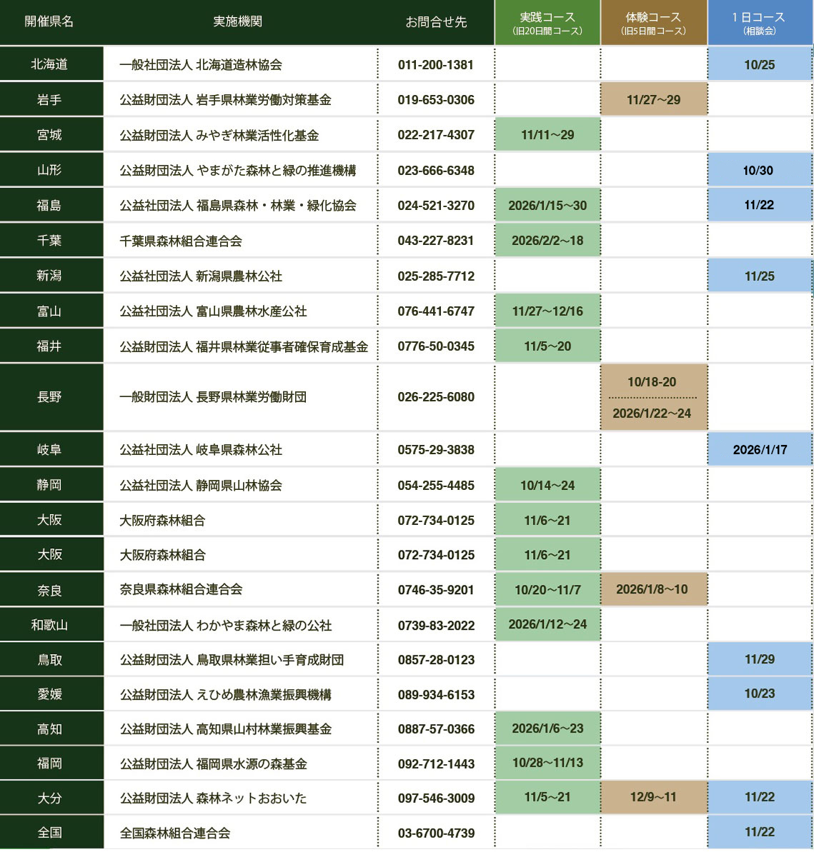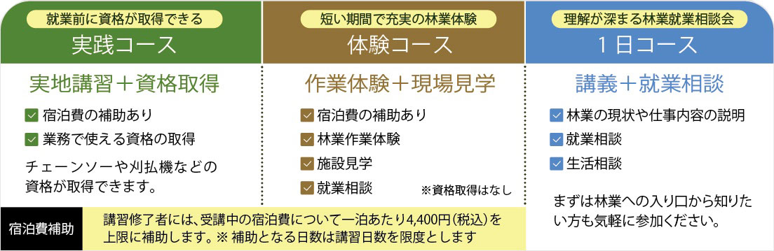 全国森林組合連合会では、林業への就職を希望する方を対象に、全国各地で林業就業支援講習を随時開催しています。受講期間の異なる3つのコースがあり、講義、体験、資格講習、施設見学を通じて林業の基礎を学ぶことができます。