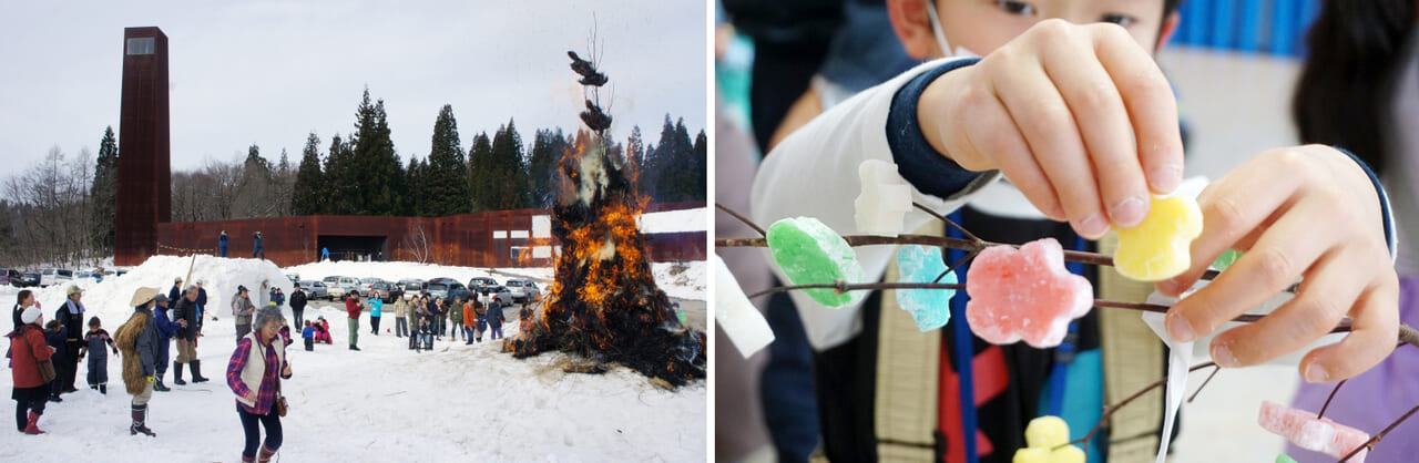 「森の学校」キョロロで、松之山に伝わる小正月の行事「若木迎え」「花餅飾り」「どんど焼き」を体験。地域に受け継がれてきた冬のならわしを、親子でお楽しみください。