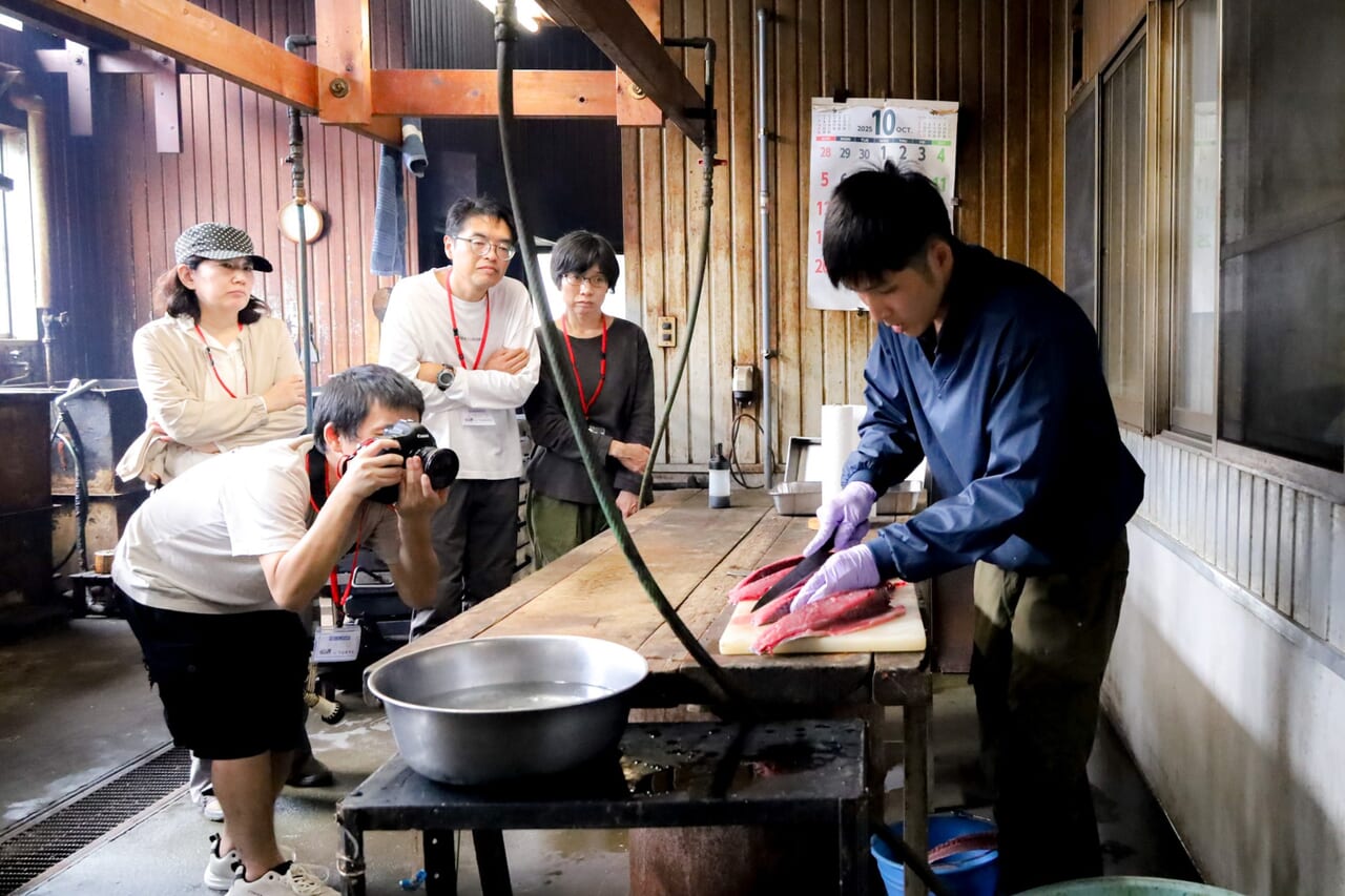 街歩きのあとは、明治10年創業の老舗『株式会社川直』へ。焼津の基幹産業であるカツオ・マグロ漁業の成長とともに発展してきた地元を代表する水産企業で、現在も焼津港で水揚げされた新鮮な魚を扱っています。