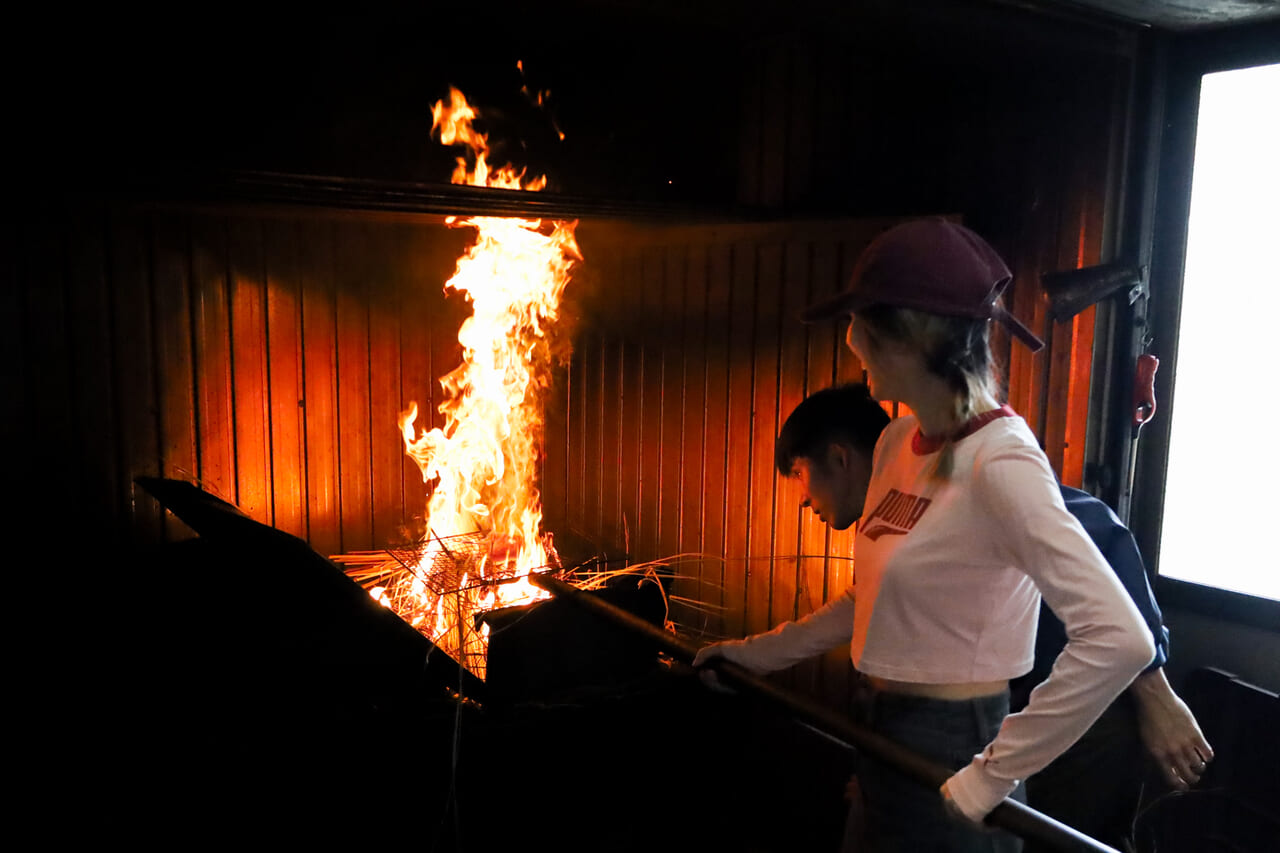ここでは、地産の新鮮なカツオを丸ごと一本、豪快に焼き上げる「カツオの藁焼き」を体験!大量の藁が一気に燃え上がる「ゴォッ!」という音と、思わず後ずさりしてしまうほどの熱気、立ち上る香ばしい煙。初めての体験に、参加者からは歓声があがっていました。