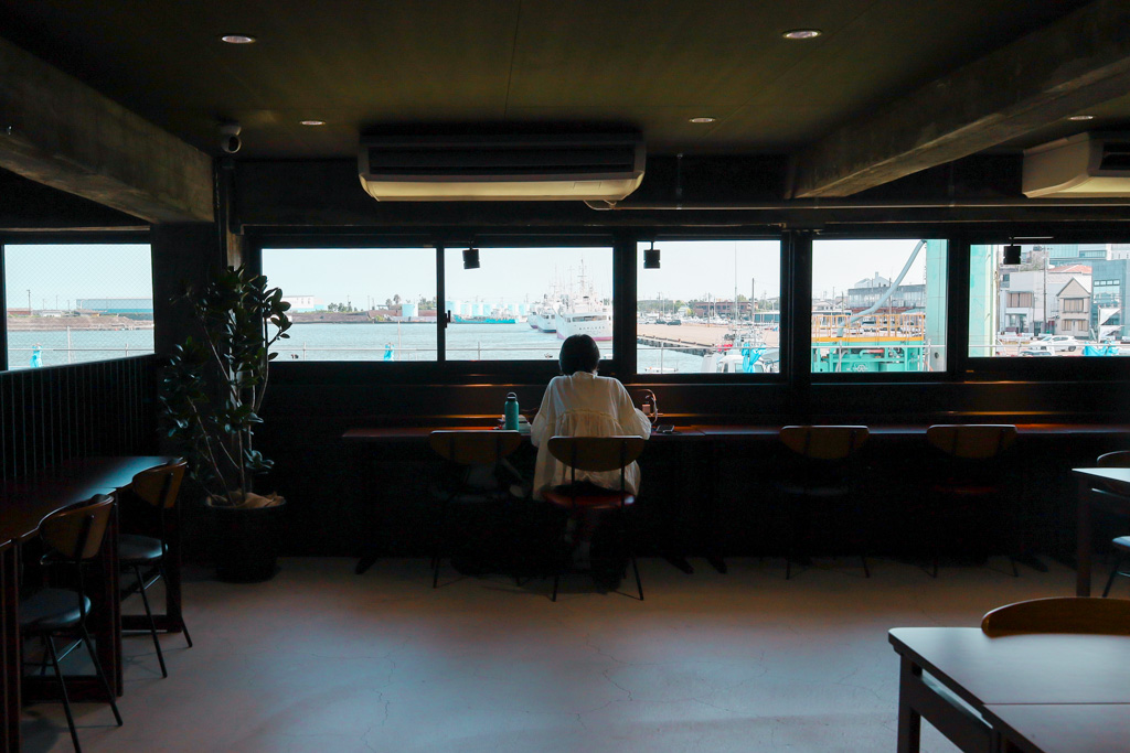 漁具倉庫をリノベーションして造られた複合施設「焼津PORTERS」へ。港を目の前に望むコワーキングスペースやフードコート、コミュニティスペース、ホテルルーム、サウナなどがそろうまちの交流拠点です。