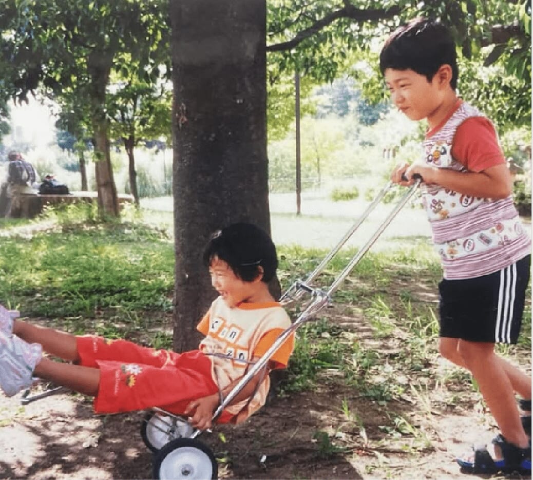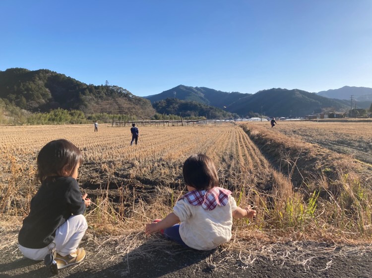 家の前に一面広がる田んぼで遊ぶ父2人とじいちゃん、