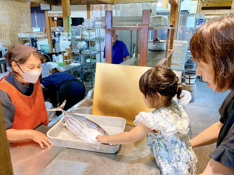 久礼で鰹のたたき体験。大きな鰹に興味津々。初めての鰹、初めての藁焼き、美味しかったね!