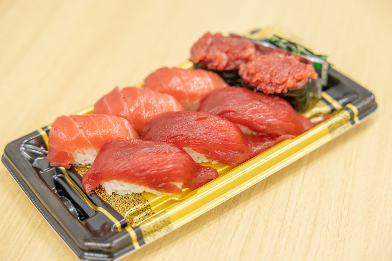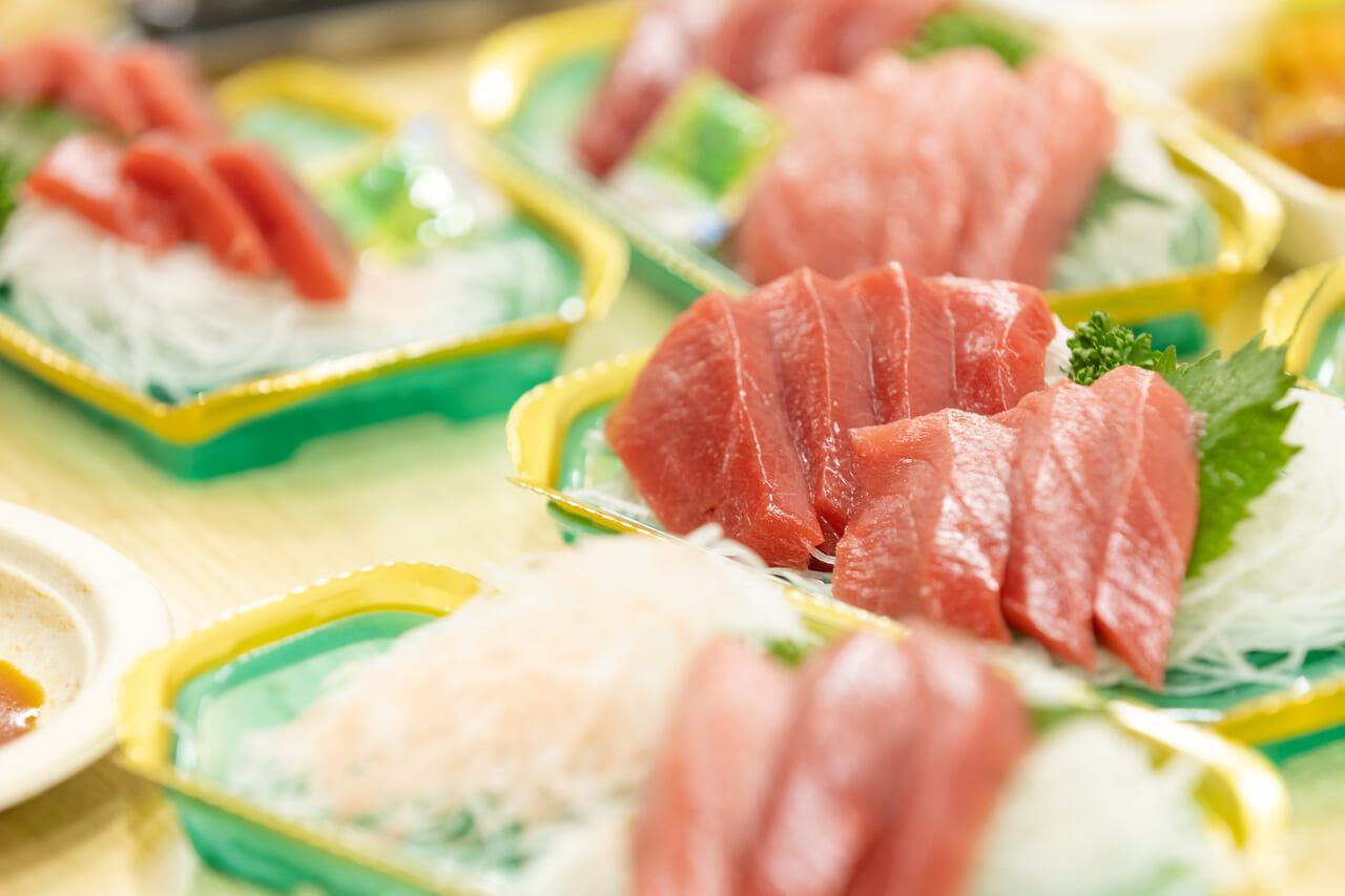 取材時、マグロの刺身や寿司、天ぷら、餃子など、自慢の惣菜を振る舞ってくれた安島社長。200キロ以下のマグロは使わないなどのこだわりが品質に表れている