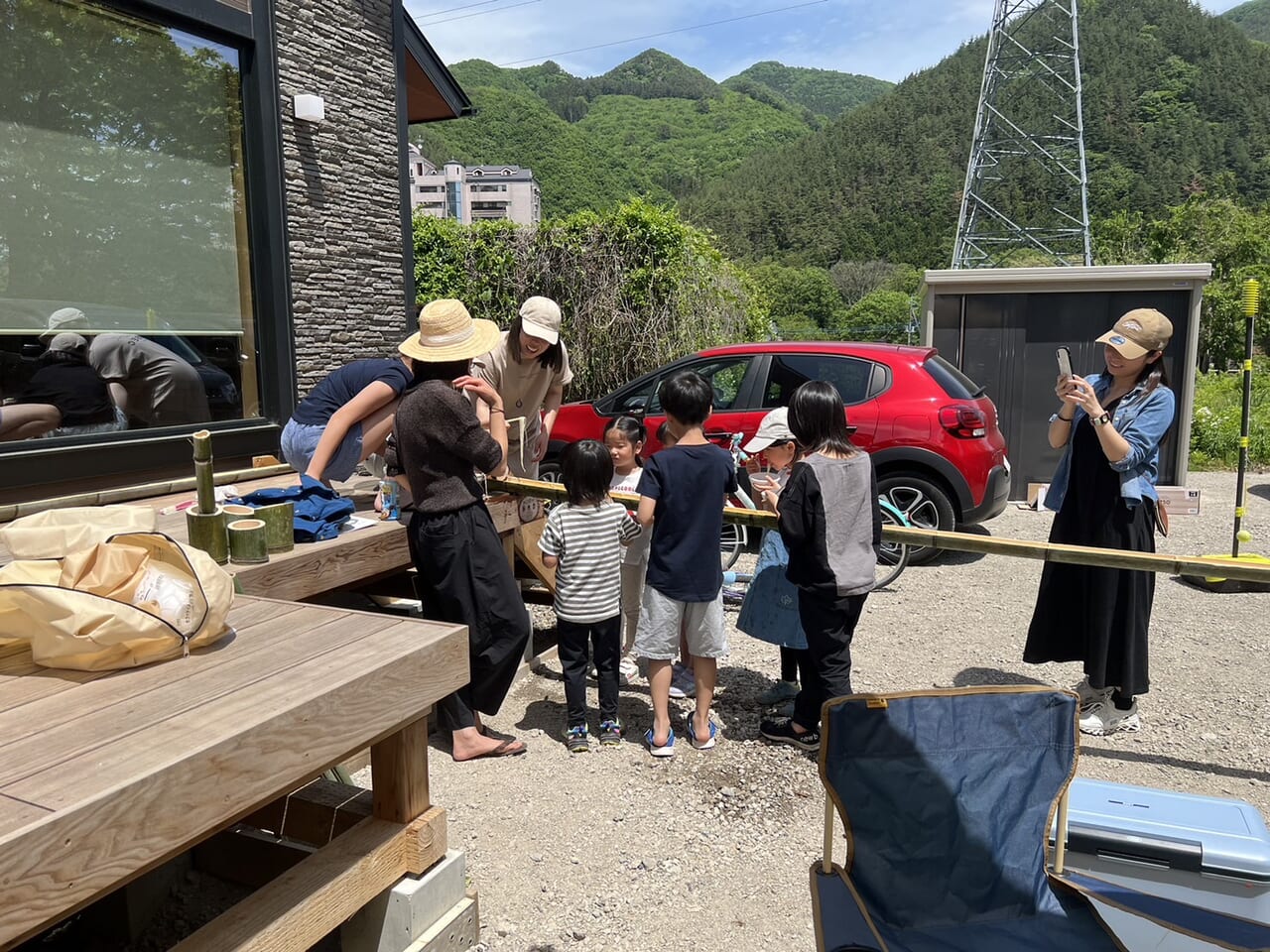 東京などから友人家族が訪れる時は、子どもたちに“都会ではできない体験”を用意。写真は、竹を割って手づくりした流しそうめんレーンで、みんなで流しそうめんを楽しむ様子。