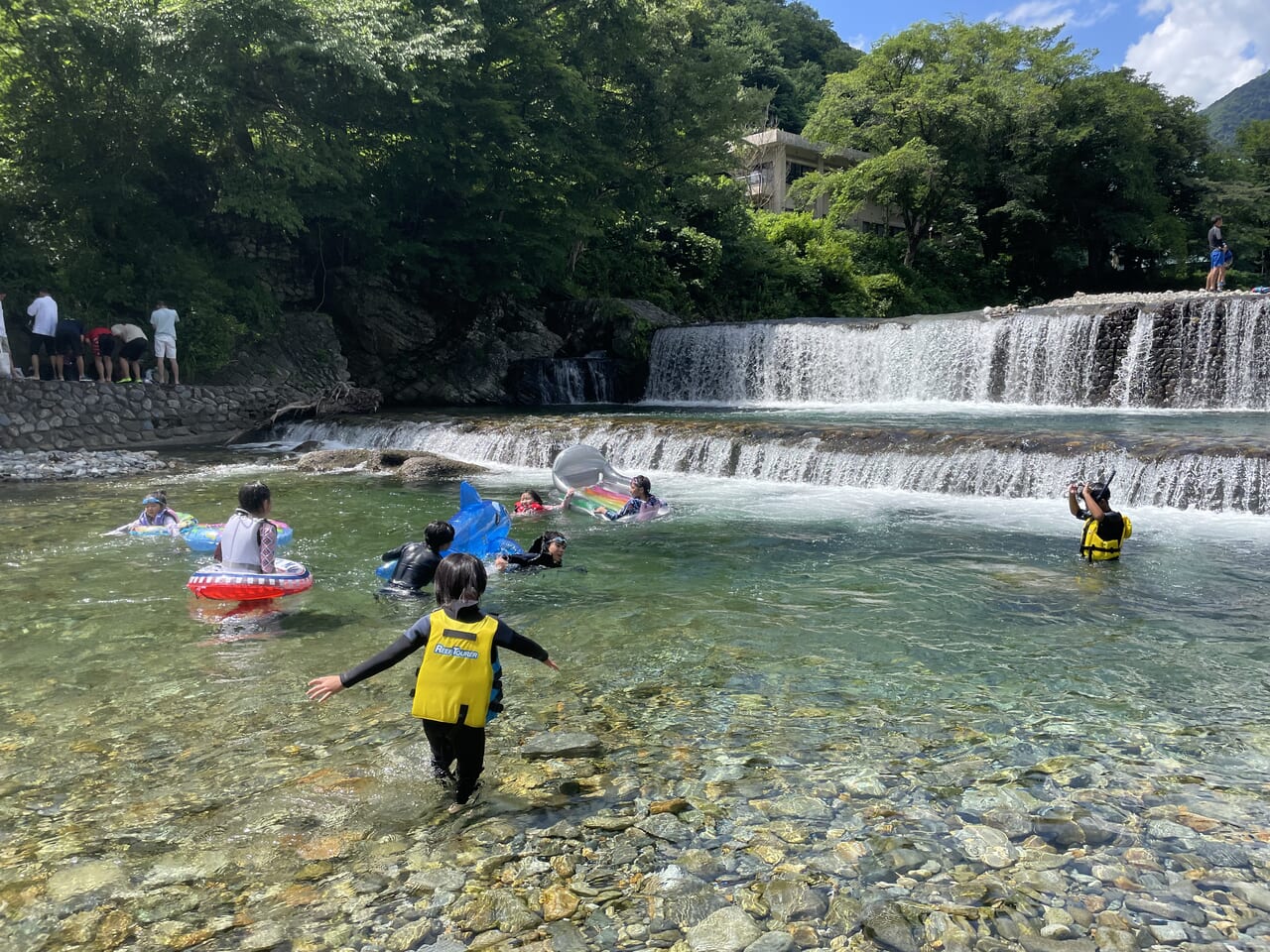 夏は車で約15分の湯檜曽川で川遊びを楽しむ。