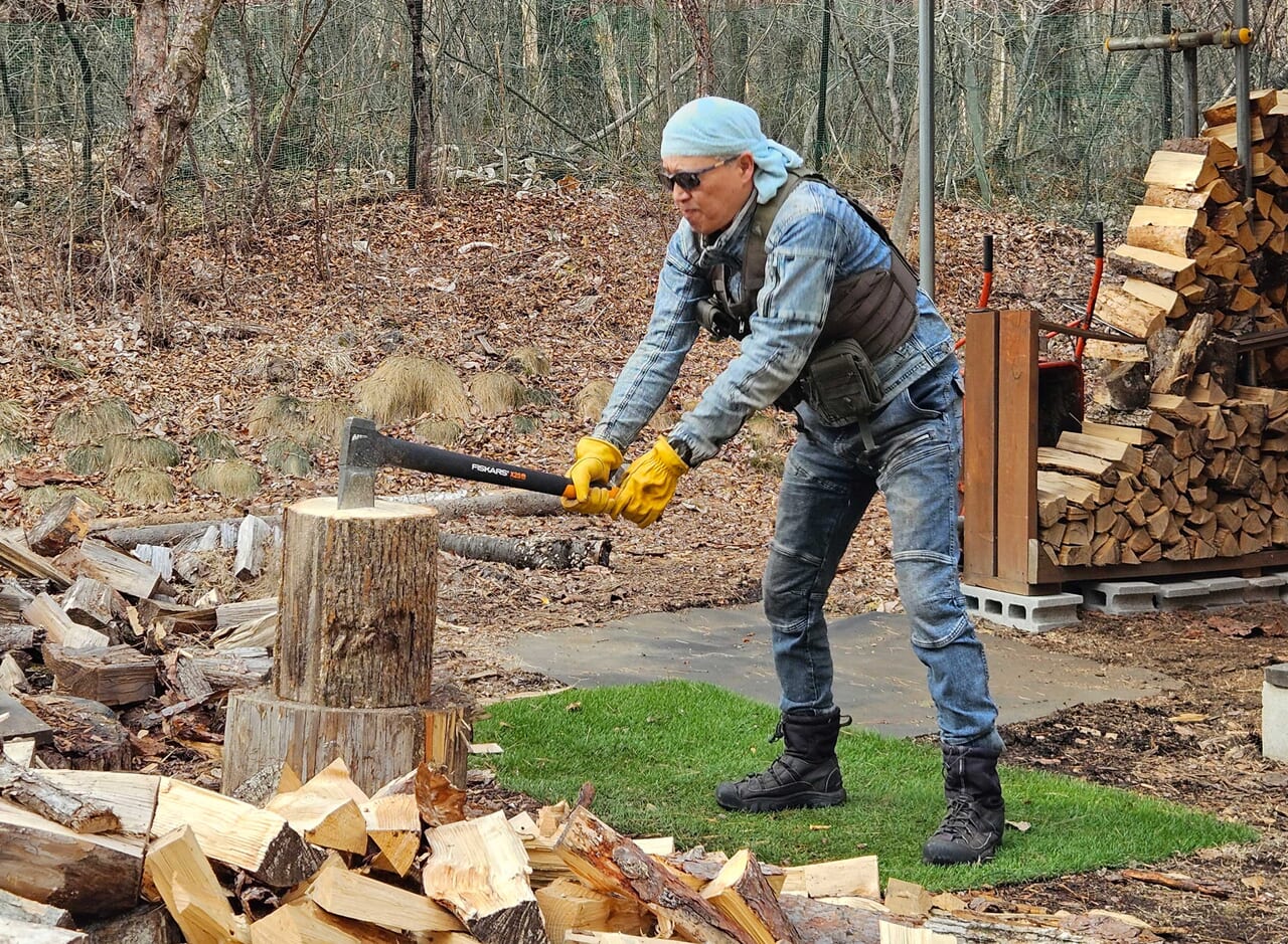 剛さんは黙々と薪割りをするのが大好きだとか。「森の静けさの中で薪を割っていると瞑想状態になります」