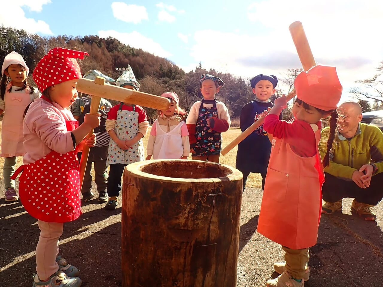 餅つき体験の様子。「さんさん森のようちえん」には、沼田市や川場村、昭和村など広範囲から子どもが通ってくる。中には移住者のお子さんも。