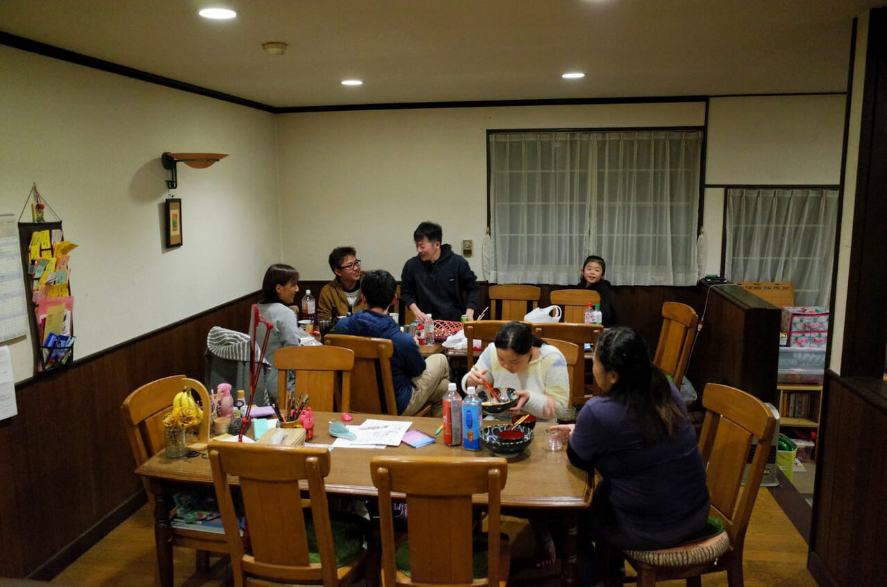 友さん|13年前に購入した元ペンションに住んでいます。冬場はスキー場のスノーボードスクールで非常勤インストラクターとして働いているのですが、その期間は我が家をスキー場のスタッフ寮として使ってもらっているんです。食堂をリビングにしていて、暖房や電気を節約するために私たちもスタッフもそこで一緒に過ごす時間が多いです。