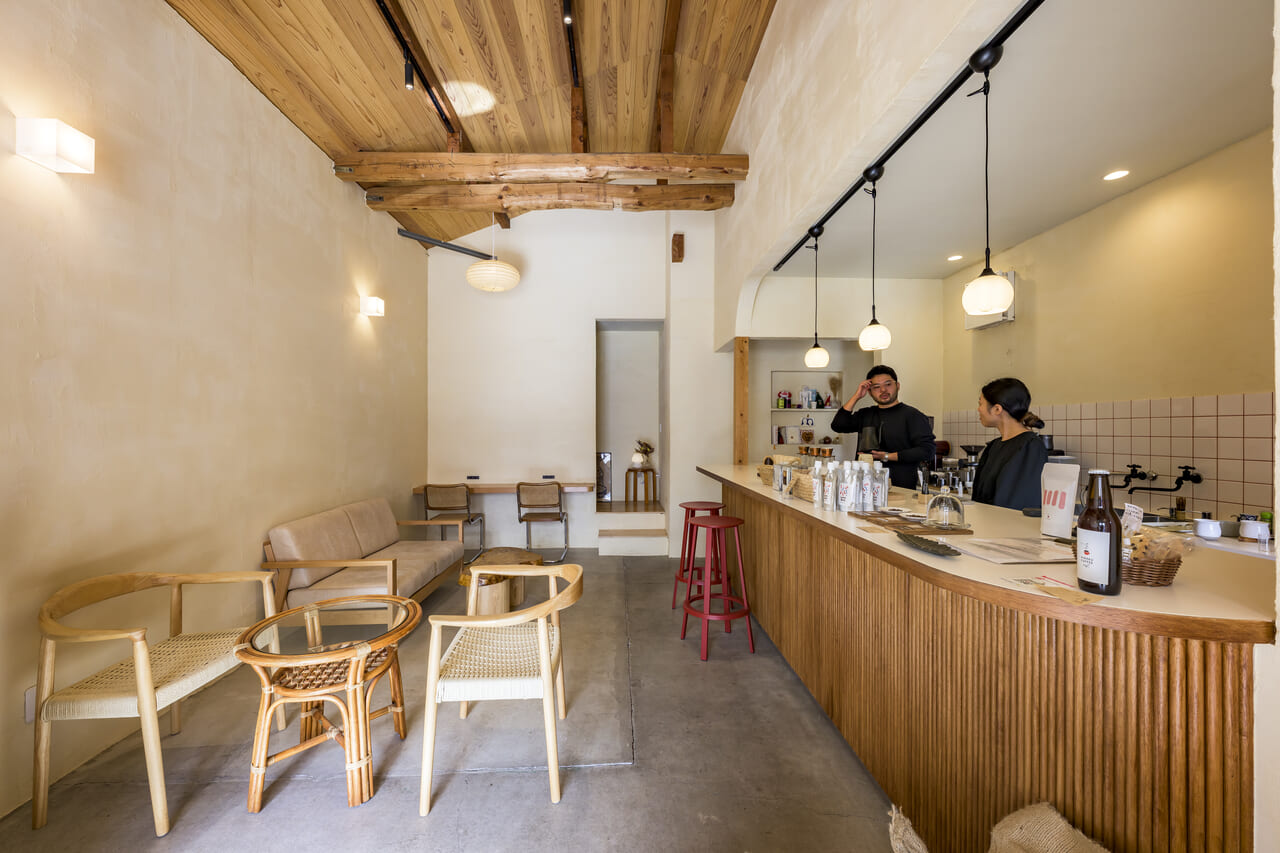 漆喰や木材の温もりに包まれる店内は、小林さん夫妻が友人たちとともにDIYで作り上げたこだわりの空間。