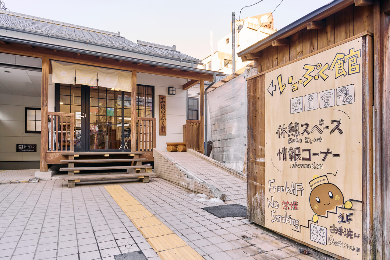 伊香保温泉の石段199段目から少し入った路地にある無料休憩施設。公衆トイレや休憩室、展示スペースが備えられており、散策の合間に誰でも気軽に立ち寄ることができる。観光案内のほか、伊香保にゆかりのある資料も展示。単なる休憩所にとどまらず、地域の歴史や魅力に触れられるスポットとなっている。