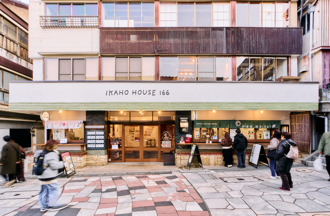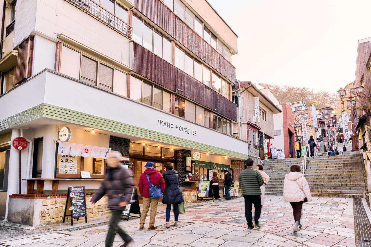 石段街166段目に建つ旧旅館をリノベーションして生まれた複合施設。1~2階は飲食フロア、3階・4階にはお土産店や伝統工芸の展示スペース、レンタルスペースなどがあり、伊香保の文化や食を楽しみながらゆったり過ごすことができる。地元作家による展示やワークショップも行われており、伊香保の過去と現在をゆるやかにつなぐ拠点として、訪れる人に新しい伊香保の楽しみ方を提案している。