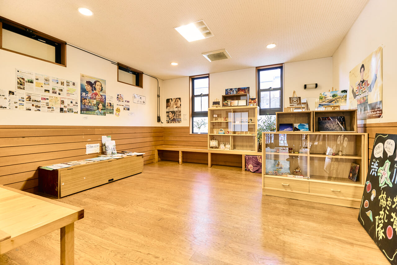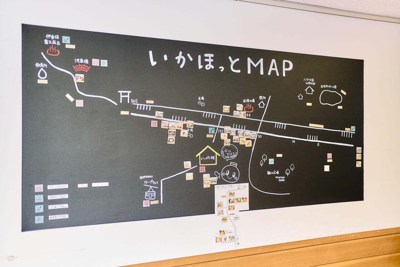 訪れる人が快適に過ごせるように、館内にはテーブルや椅子、ストーブを配置。伊香保周辺の観光ガイドや、個性豊かなお店やイベントのフライヤーも揃えた。壁には伊香保の歴史を伝える昔の写真を展示し、この界隈のおすすめスポットを案内する手書きの地図も掲示されている。
