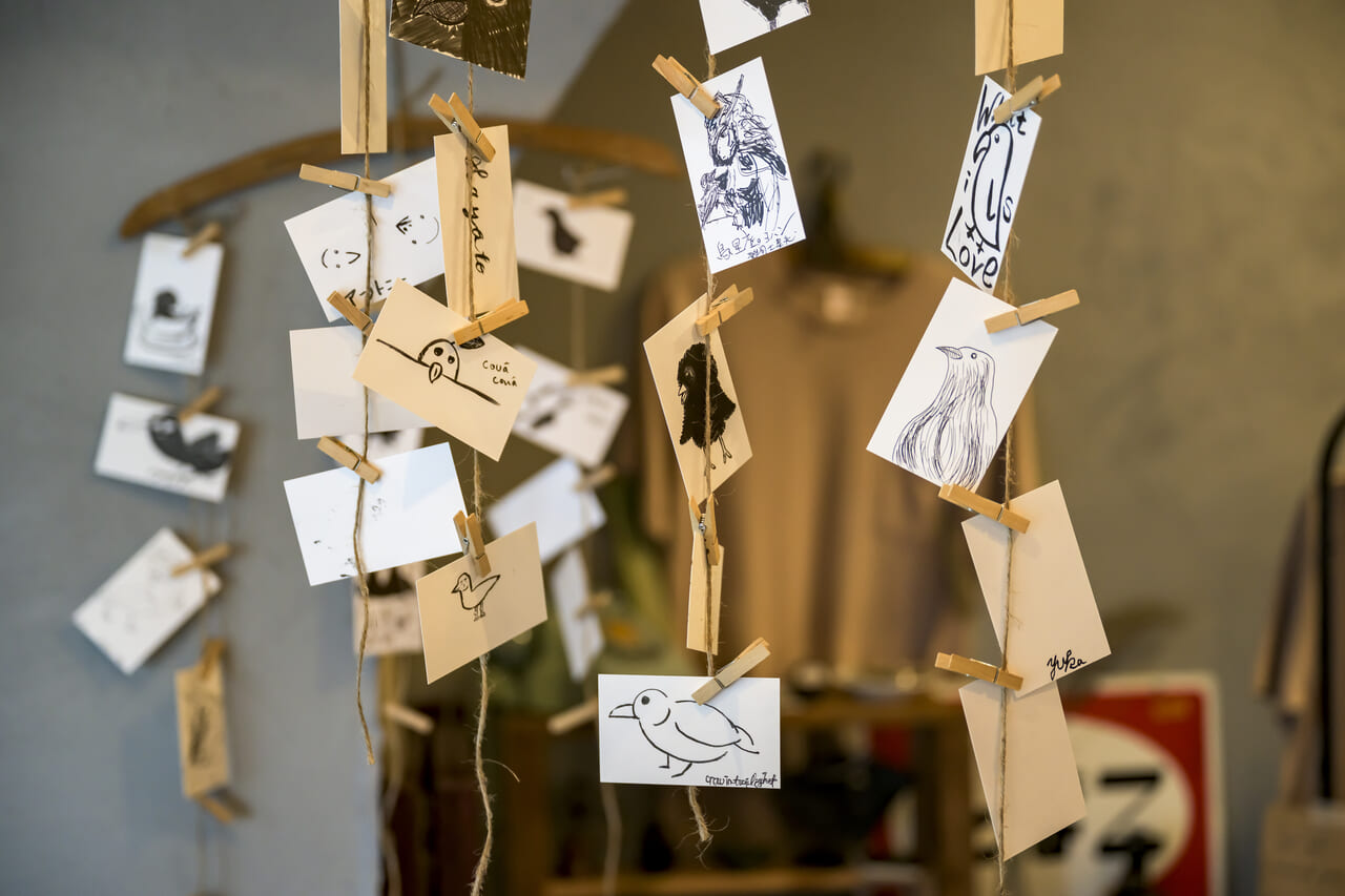 「さんぽ屋」の店内の棚には、他の個人店の名刺がたくさん置かれている。