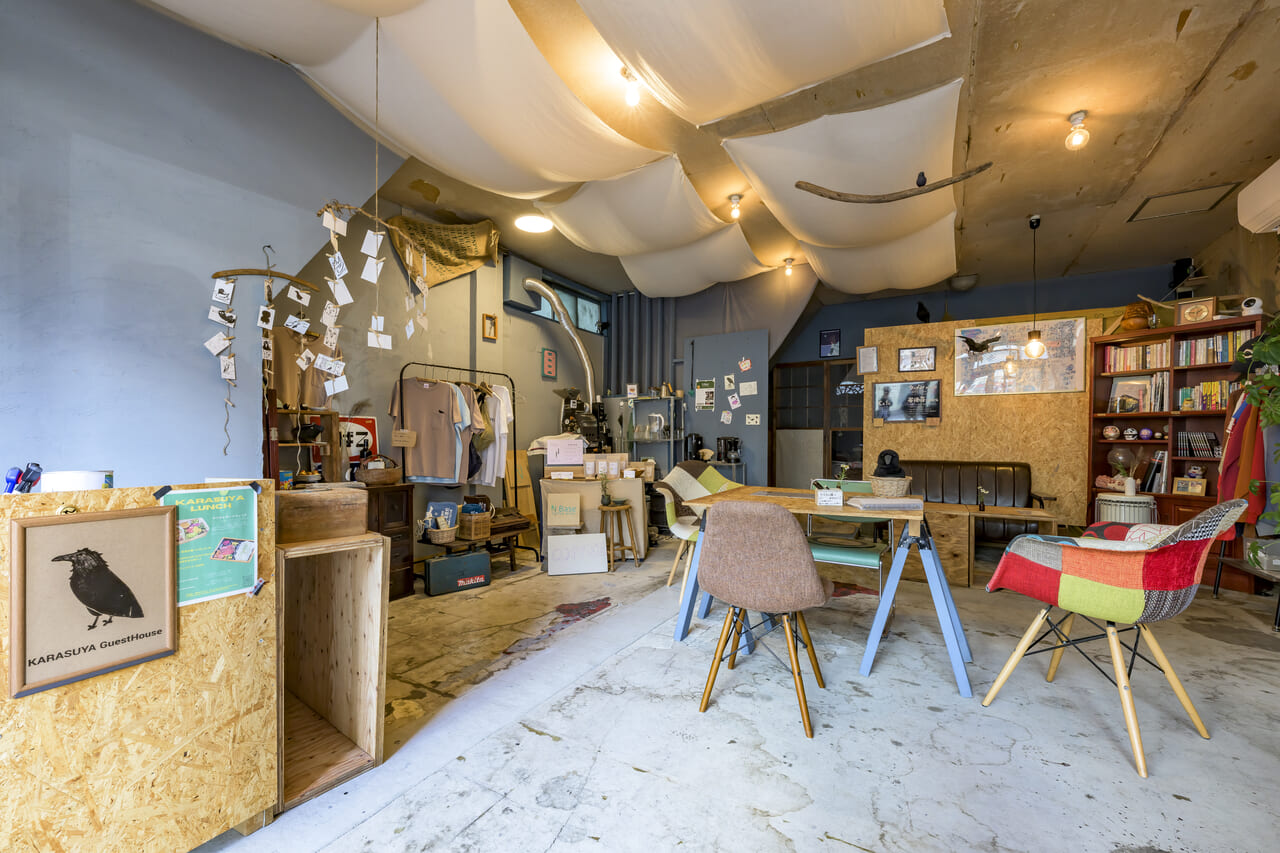 (KARASUYA)旅人同士や地域の人との出会いが生まれるラウンジ。