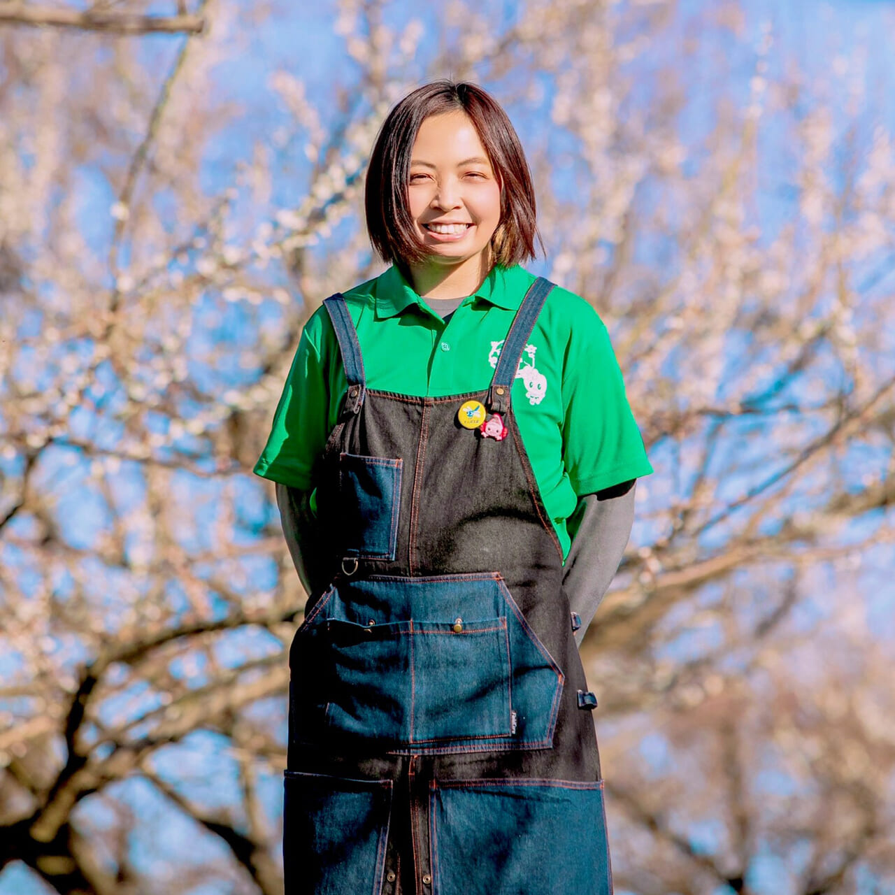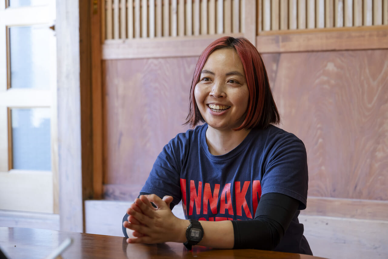 梅の花カラーに染めた髪は、ご本人曰く「ずっと梅と関わり続けていく覚悟」の表れ。作業服を選ぶ時も自然と赤色を選んでしまうと言い、秋間梅林への愛を全身で表現している。