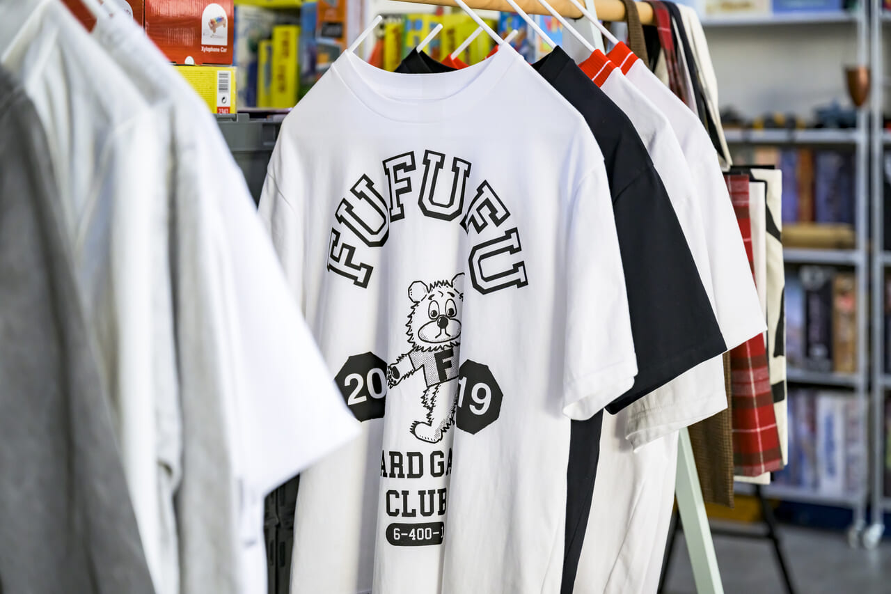 桐生をはじめ国産の繊維で仕立てたアパレルやオリジナルTシャツも並ぶ。