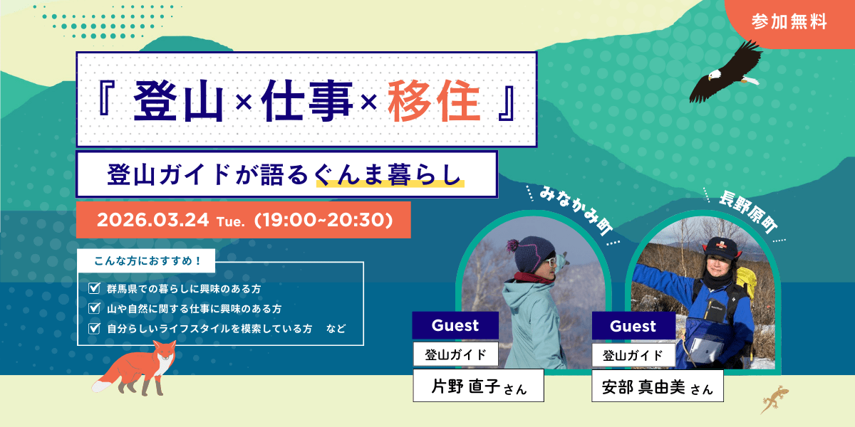 今回のセミナーでは、そんな群馬県に移住し、登山ガイドをされているお二人のゲストをお招きし、“仕事”と“暮らし”の側面から移住地としての『ぐんまの魅力』についてたっぷり語っていただきます。