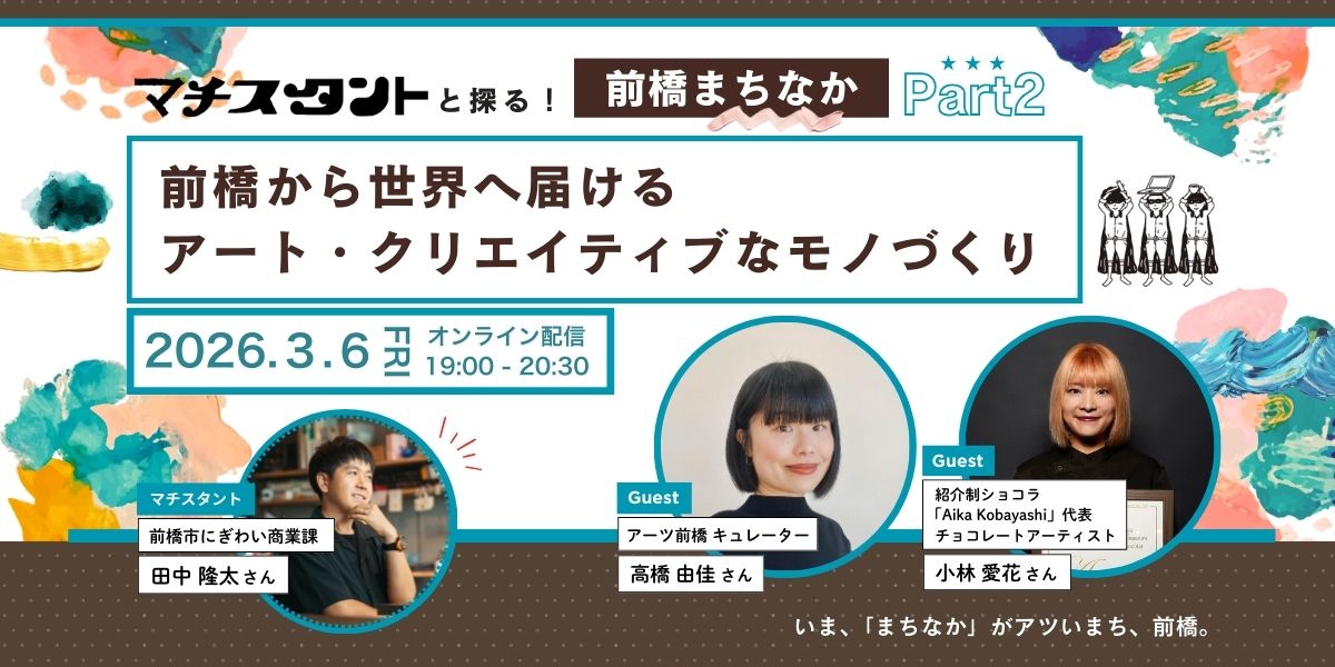 今回は、「前橋から世界へ届けるアート・クリエイティブなモノづくり」をテーマに、「アーツ前橋」キュレーターの高橋由佳さんと「Aika Kobayashi」チョコレートアーティストの小林愛花さんをゲストに迎え、前橋まちなかの「今」を語ります!