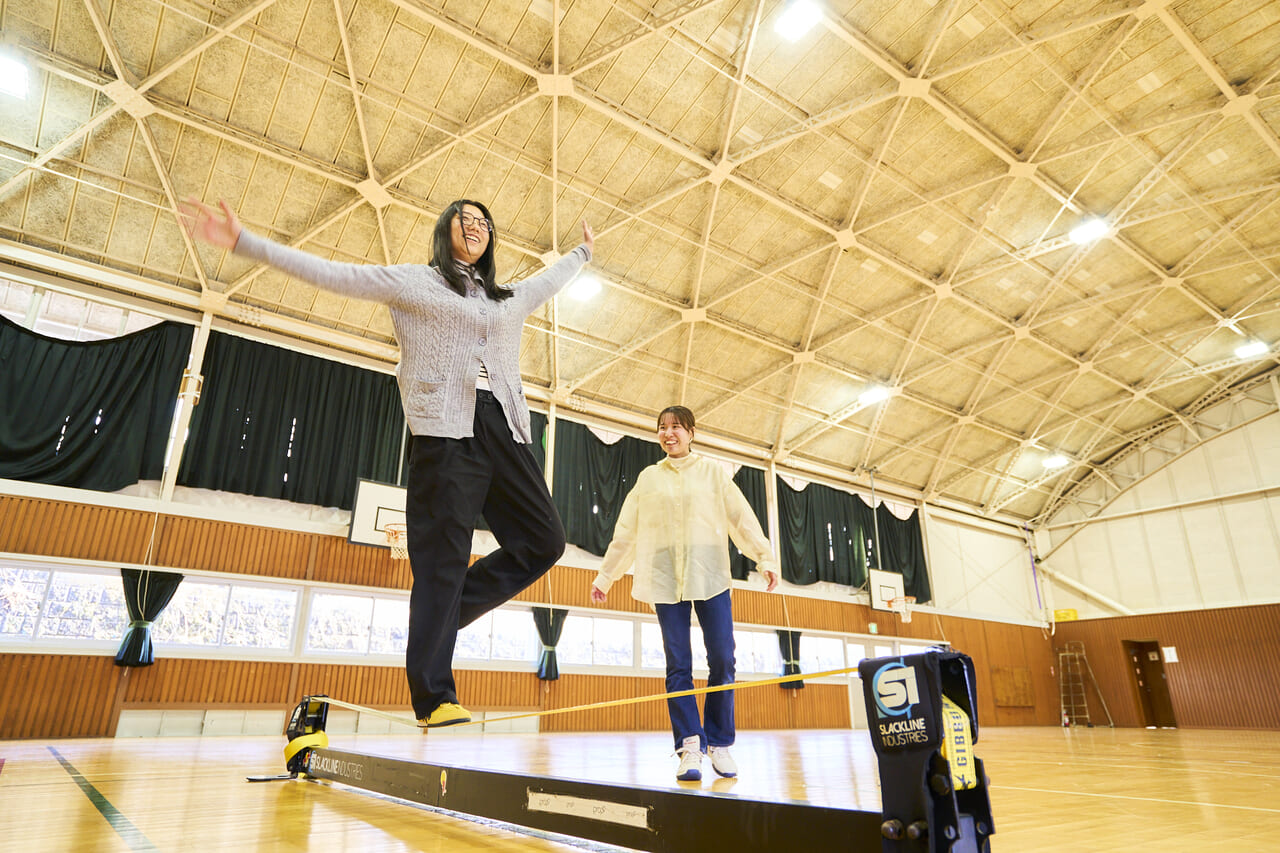 細いラインの上でバランスを取りながら体を動かすスポーツで、体幹が試されます。一歩踏み出すだけでも難しく、しゃがもうとするとさらにバランスが崩れてしまい、思わずこぼれる笑い声が館内に響きます。