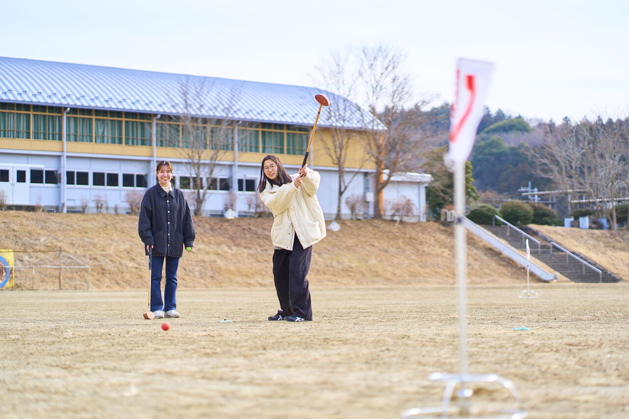 さらに校庭へ出て、グラウンドゴルフも体験。シンプルなルールながら、ボールを思った通りの方向に打つのは意外と難しく、コントロールの奥深さに四苦八苦。