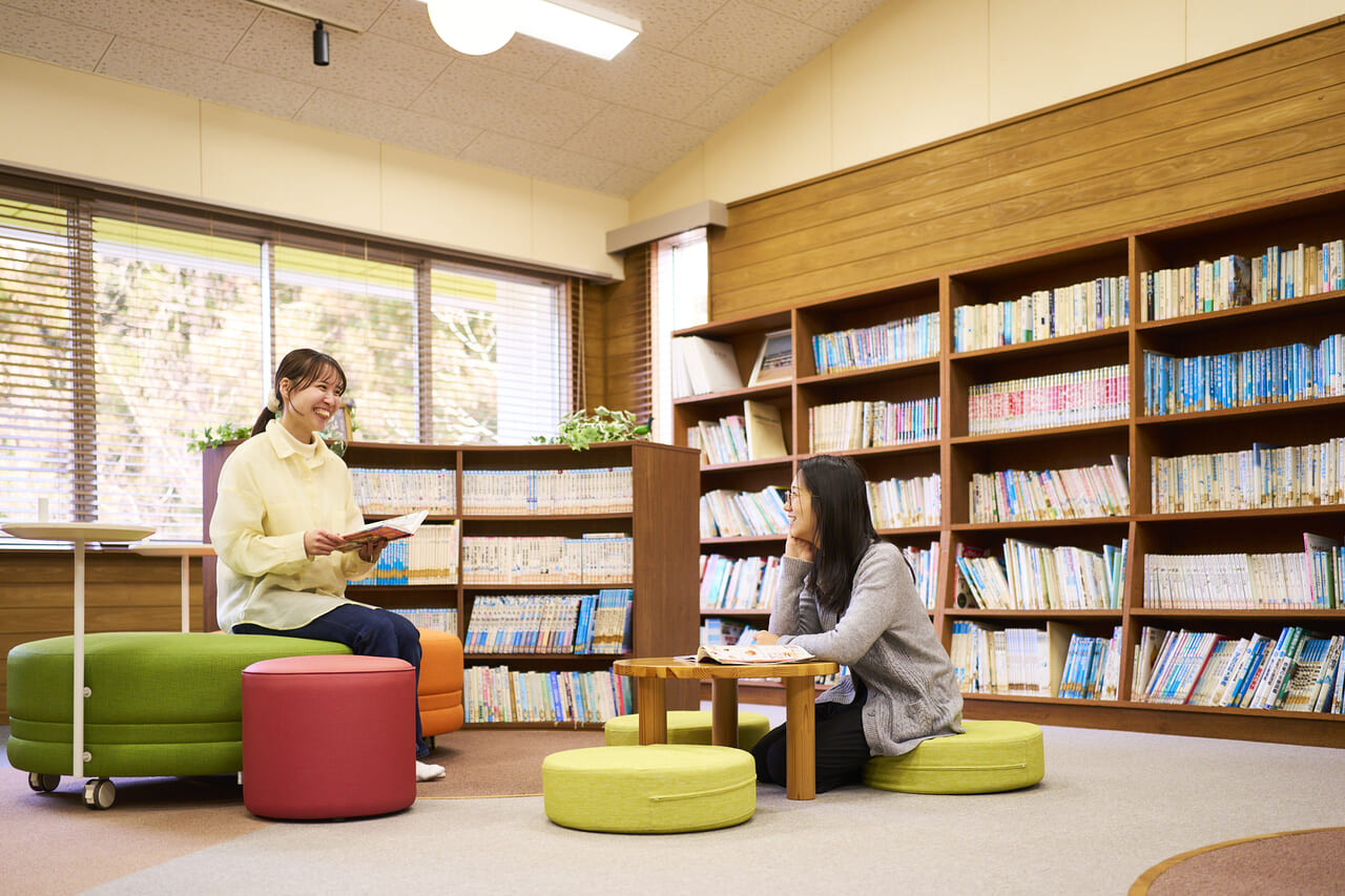 里山に包まれた静かな図書室で、本を読みながらゆっくりと流れる時間に身をゆだねる。そんなひとときも、かなさ笑楽校ならではの魅力です。