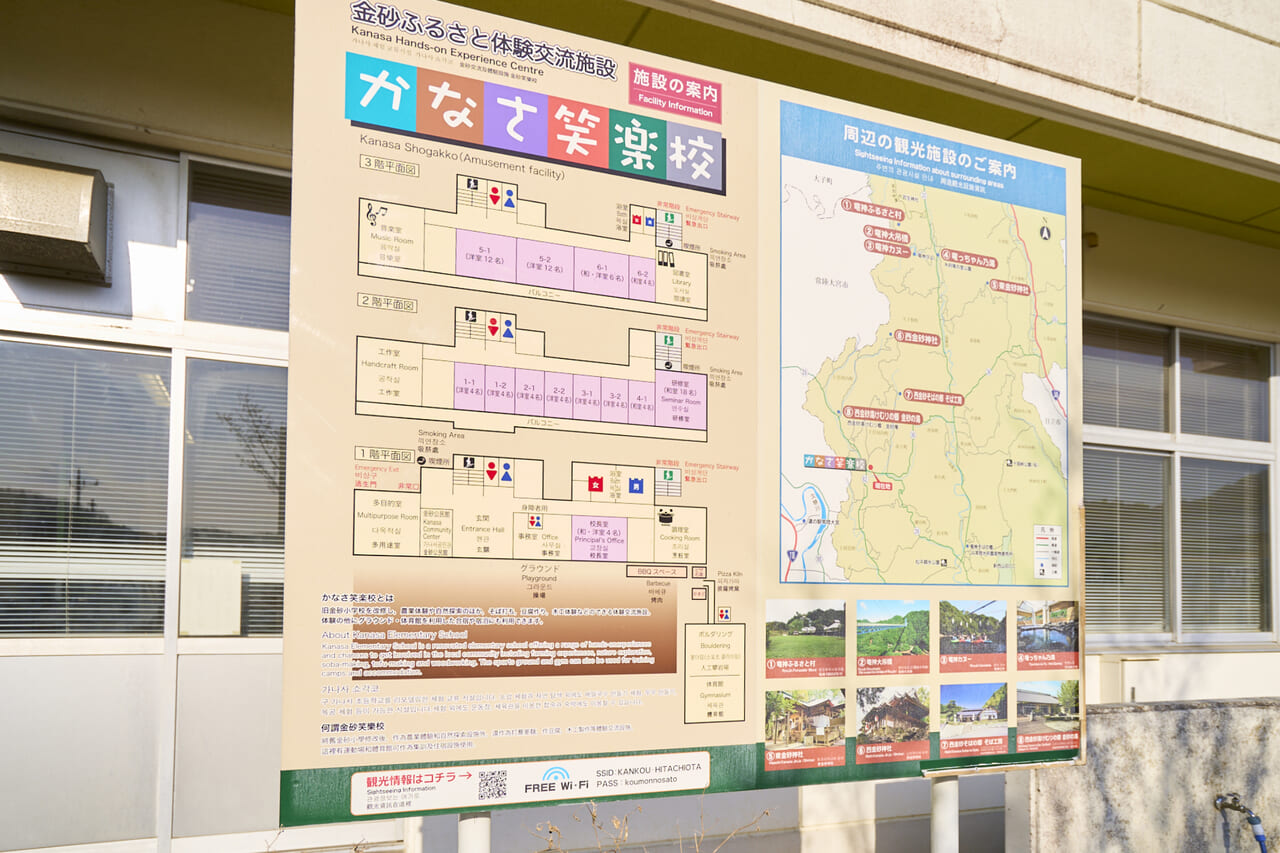 校内マップと周辺の観光施設を紹介する案内看板。近年ではこの施設を拠点とし、移住の下見に訪れる人もいるという。