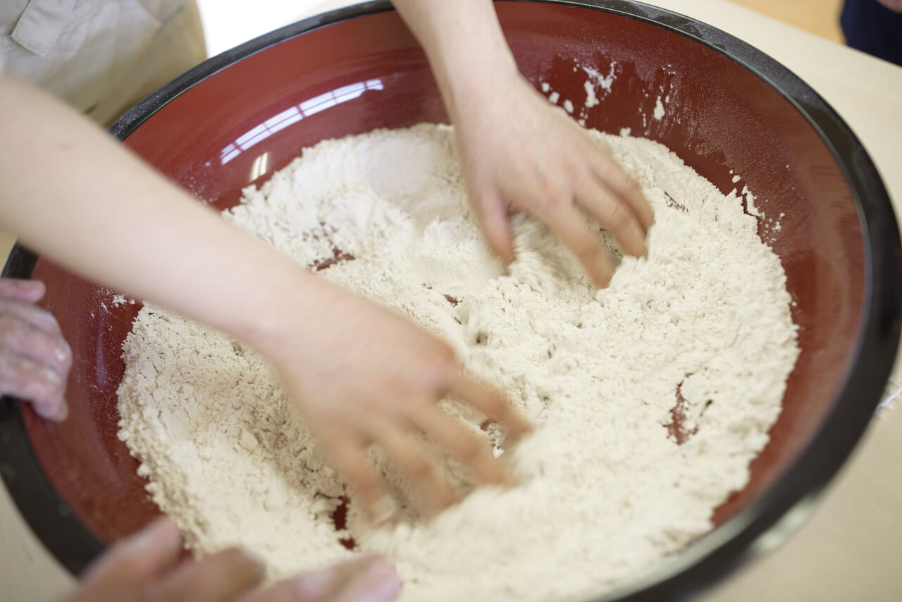 粉に水を加えて生地をこねる作業は、想像以上に力のいる本格的な工程。地元のそば打ち名人のレクチャーを受けながら、少しずつコツをつかんでいきます。